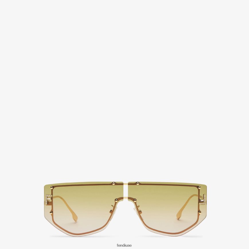 نظارات فندي فيرست شيلد الشمسية مع أذرع معدنية ذهبية اللون وعدسات متدرجة من الكاكي إلى الوردي مع ميكرو إف في البلورات. وسادات أنف قابلة للتعديل.